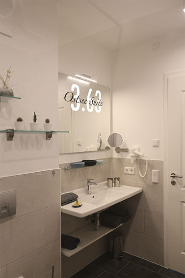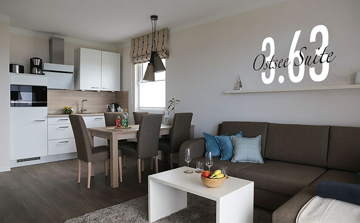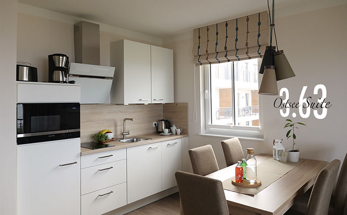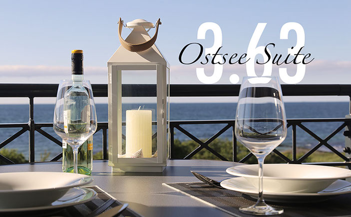 Die exklusive Suite in der dritten Etage verfügt über einen geräumigen Flur, einem Wohn-Essbereich mit hochwertig eingerichteter Küchenzeile inkl. Geschirrspüler, einem Schlafzimmer sowie einem zusätzlich kleinen Schlafraum und einem Duschbad. Über dem Balkon blicken Sie direkt auf die Ostsee.